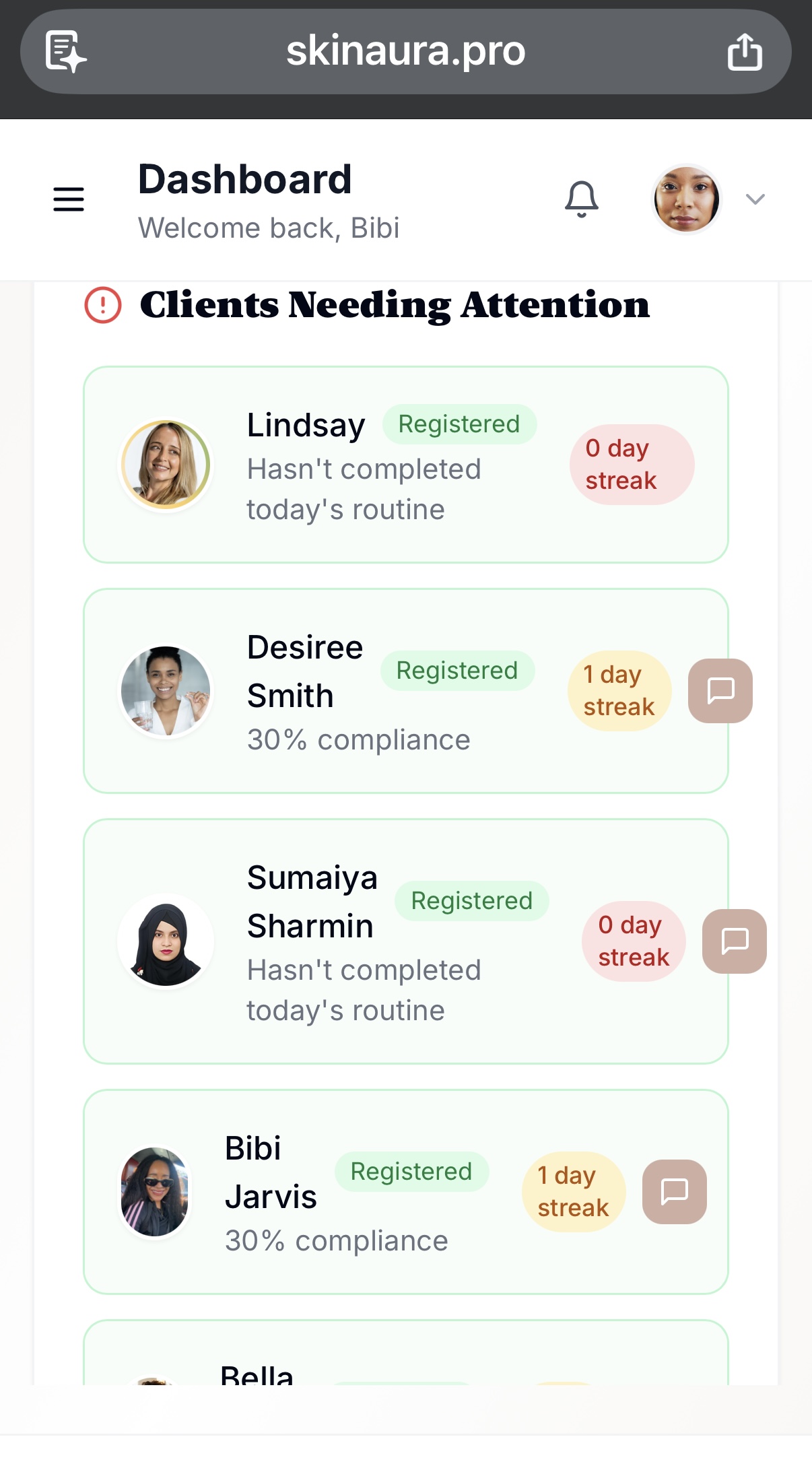 SkinAura PRO Client Management System: Automates routine tracking, sends personalized SMS reminders, and provides real-time compliance monitoring. Perfect for practices managing 50+ active clients who need consistent engagement support.